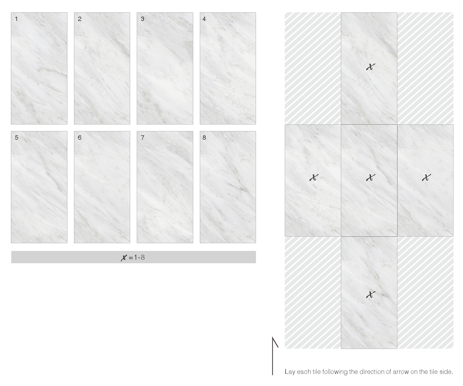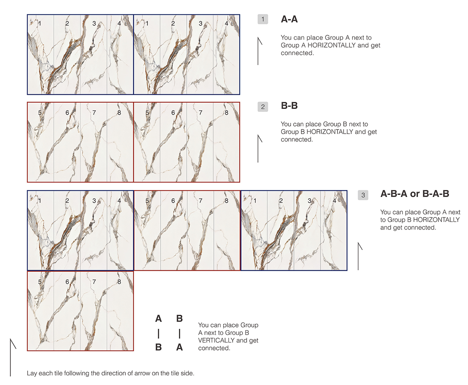 When each tile is paved following the direction of arrow on the tile side, it's possible to lay all the patterns in any order and always get veins connected with no repetition, perfectly to show the beauty of space extension. Also, easiness in installation. All connected veins products can be paved in an infinite design.